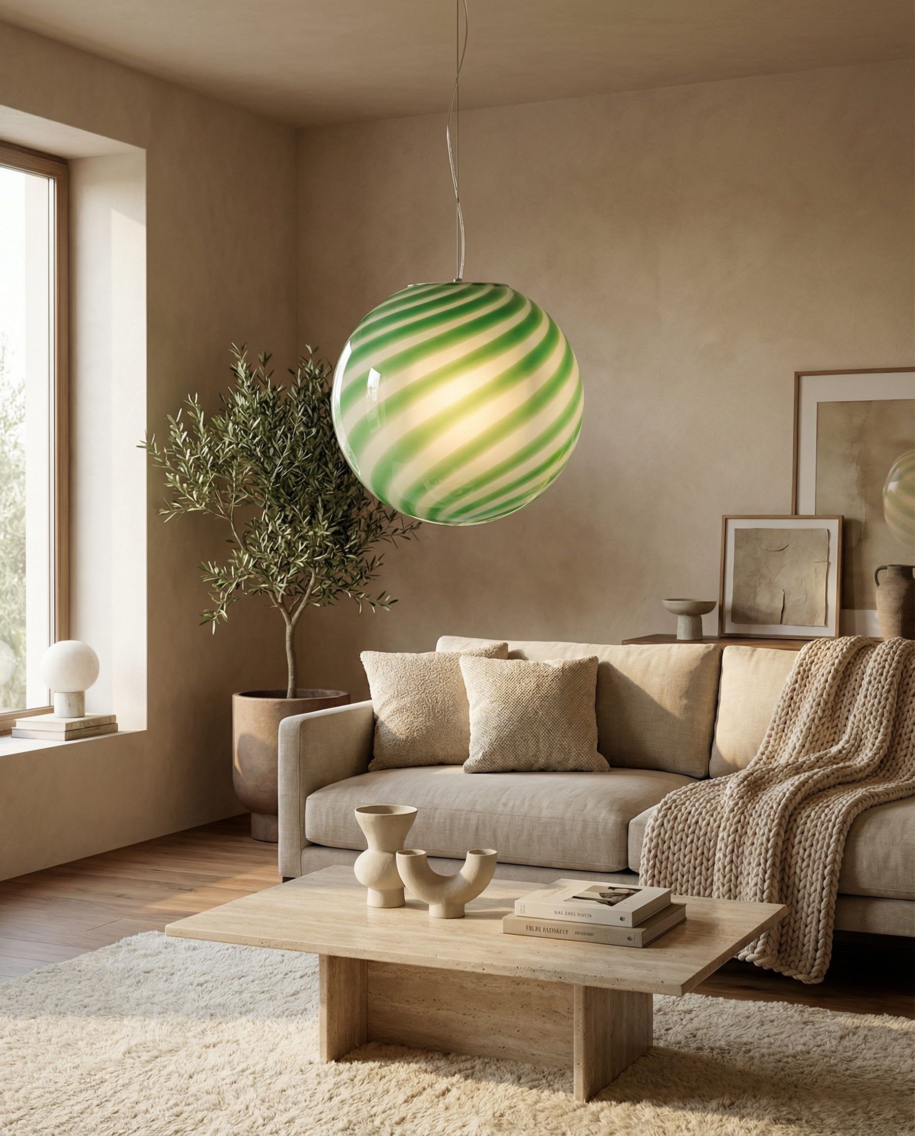 Handcrafted Murano glass pendant lamp featuring an elegant "green mint swirl" pattern reminiscent of classic candy stripes. Its distinctive round shape creates an elegant presence on any surface, casting warm, diffused light through authentic Italian glass.