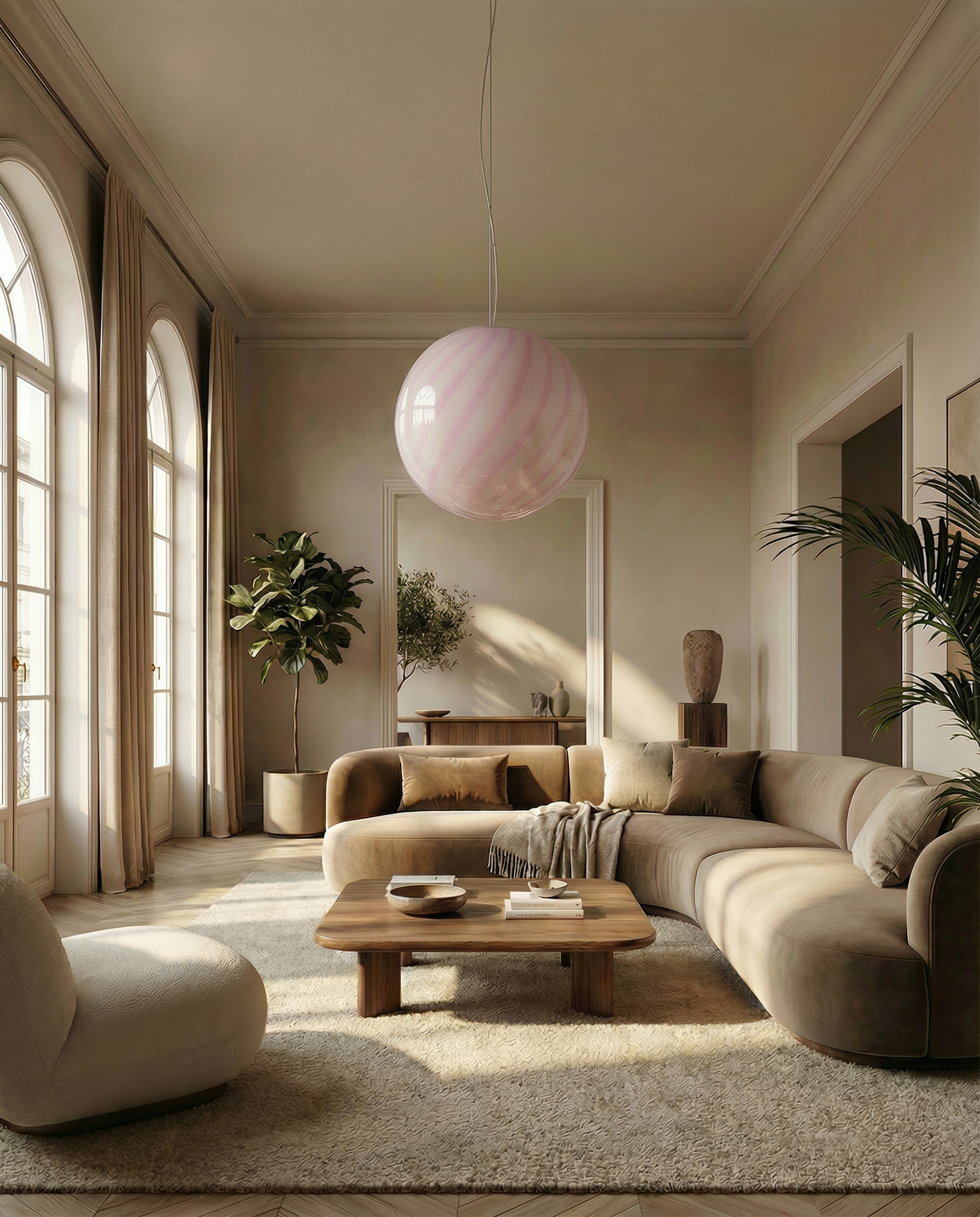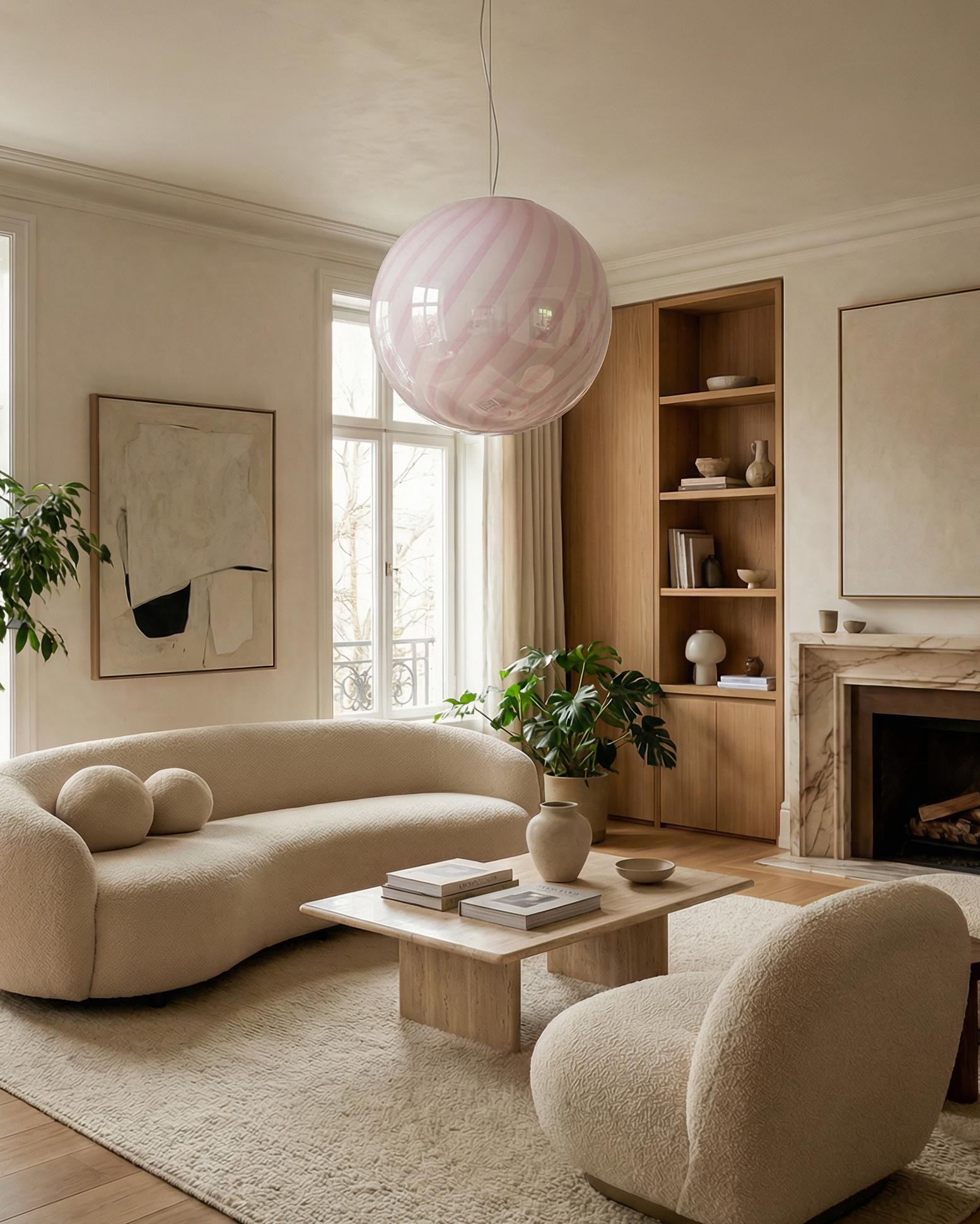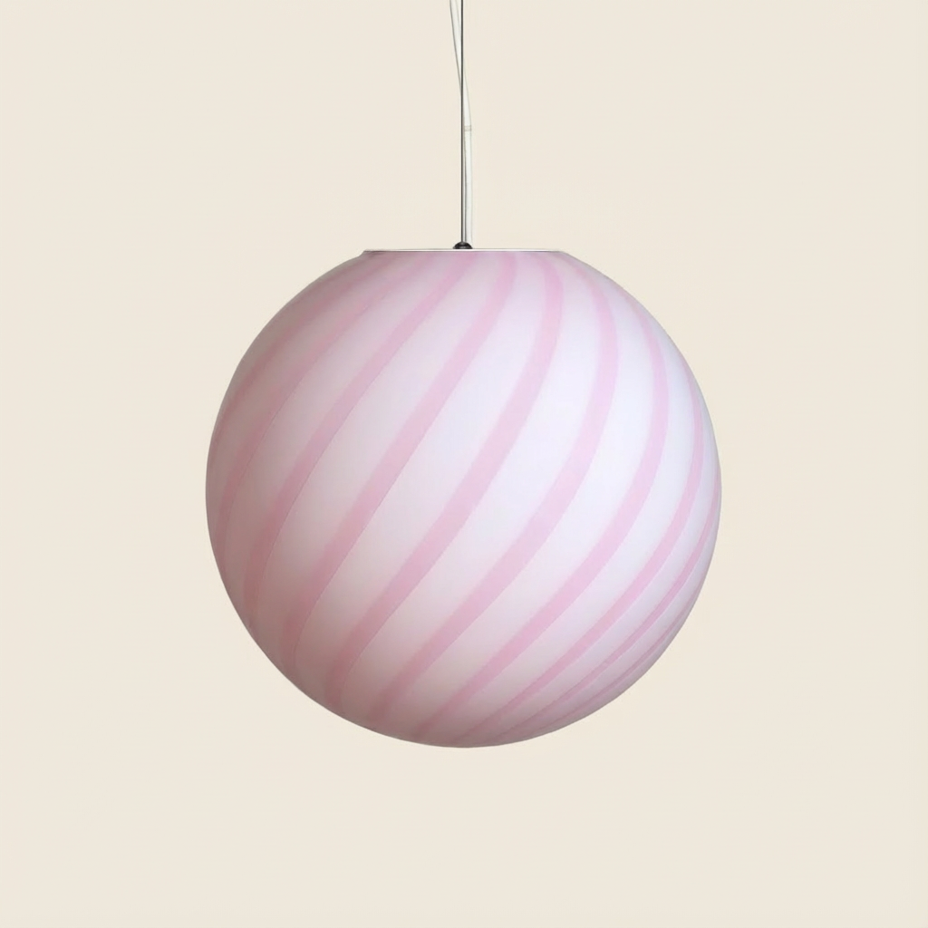 Lampada a sospensione Candy a sfera in vetro di Murano con vortice rosa marshmellow D40