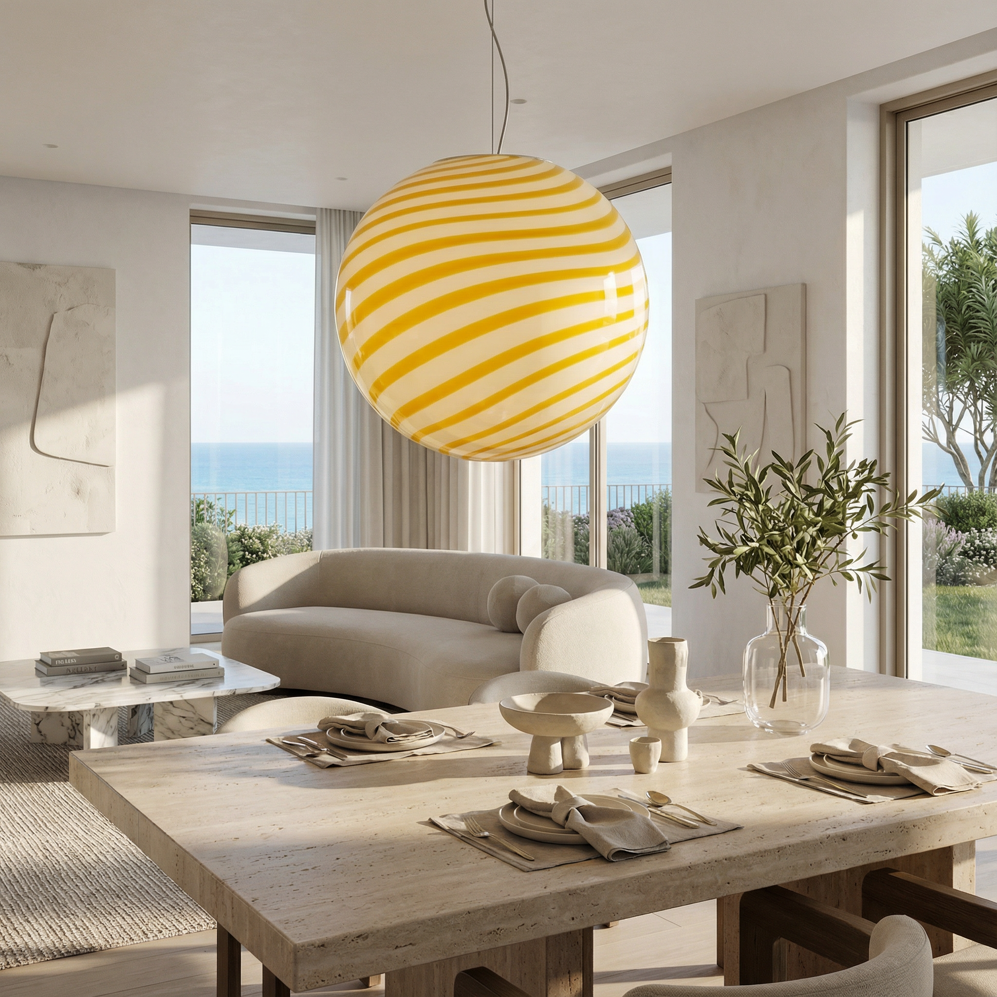 Lampada a sospensione Candy a sfera in vetro di Murano bianco e giallo a spirale D40