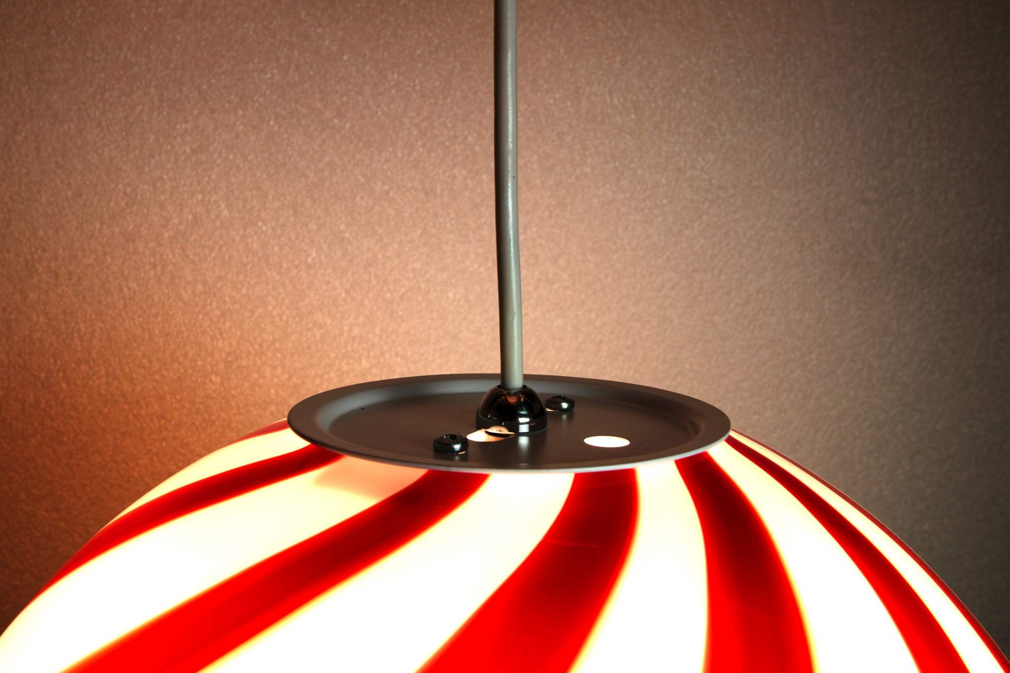 La lampada Murano Candy è realizzata a Venezia, in Italia, con le tradizionali tecniche del vetro soffiato a bocca ed è dotata di un portalampada E27. Include un sistema di sospensione regolabile per adattarsi a diverse altezze di installazione. L'opera misura 30 cm di diametro e pesa circa 3 kg.