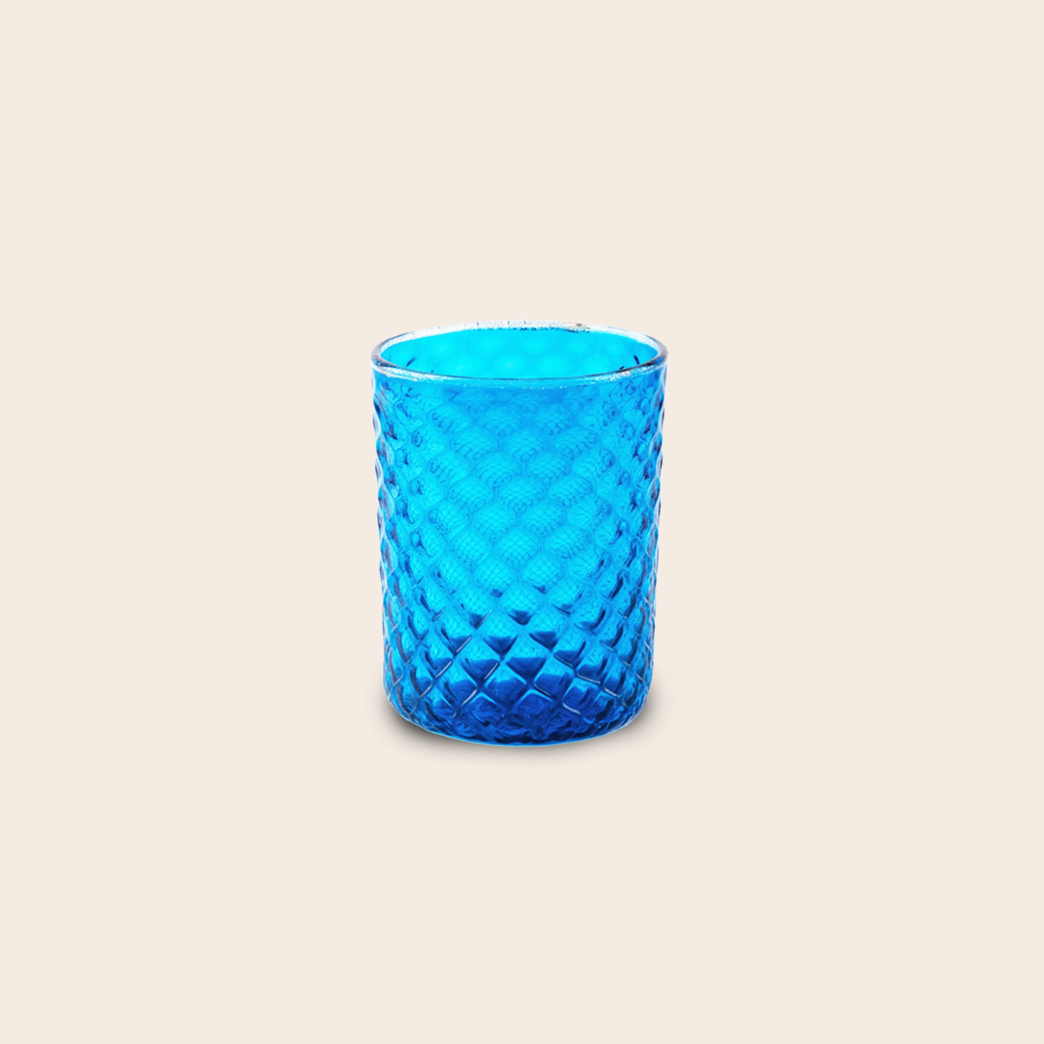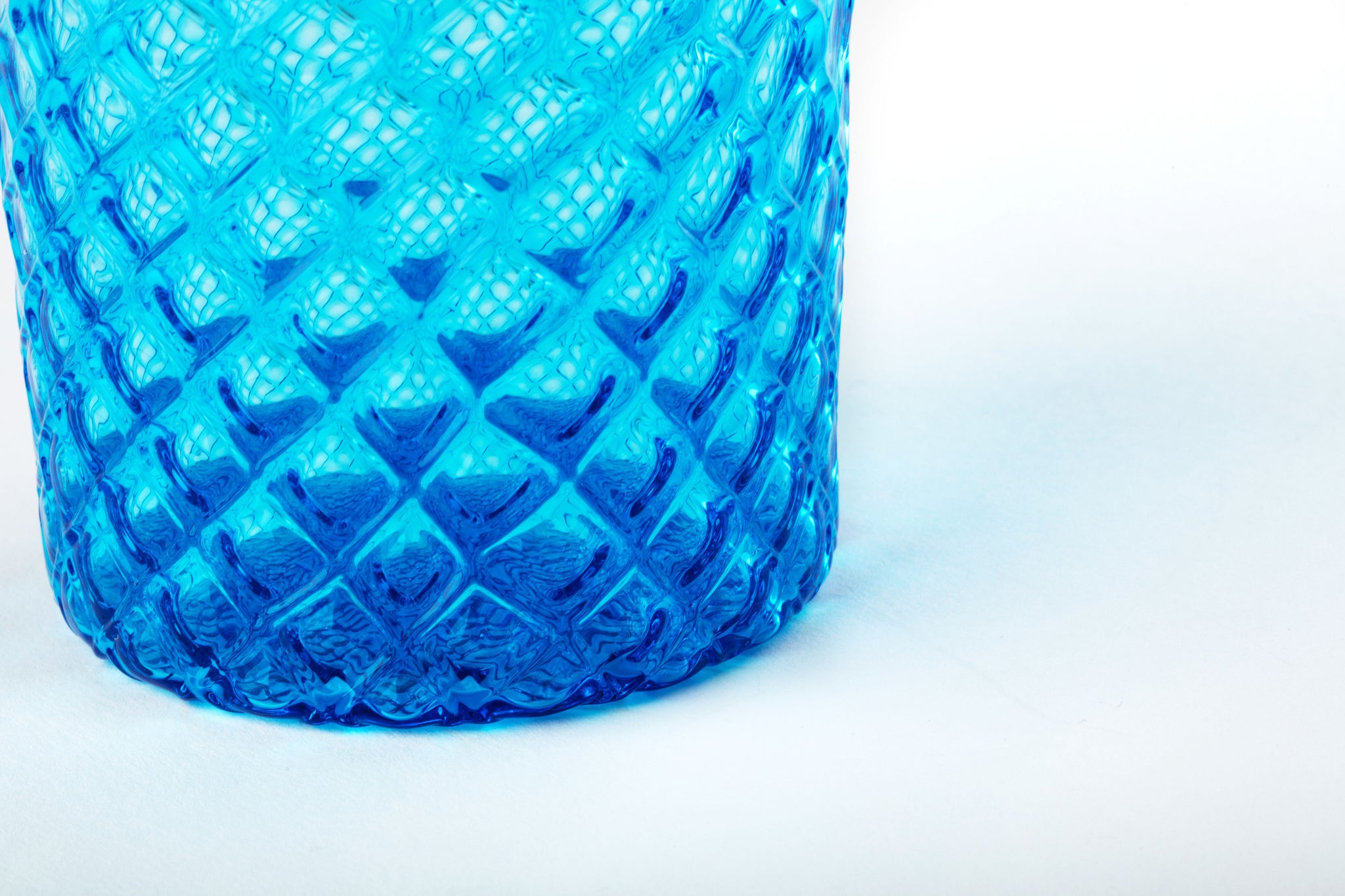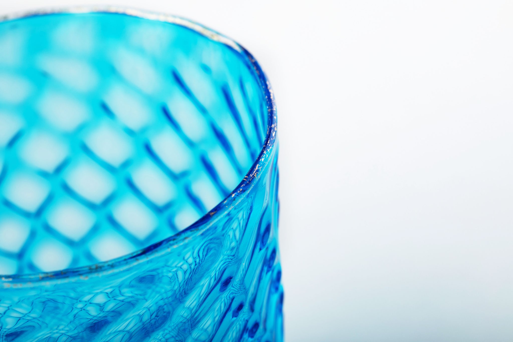 Set di 6 Bicchieri “Aquamarine Tola Goti”, reticello, creando un raffinato rilievo in vetro soffiato su tutta la superficie. Ogni pezzo è modellato individualmente, dando origine a sottili variazioni che ne evidenziano la natura artigianale. Il bordo presenta un delicato incalmo con un filo di vetro trasparente arricchito con oro sommerso, che aggiunge un elegante tocco finale. Ogni bicchiere misura circa Ø 8 cm x A 10 cm, con lievi differenze che riflettono l'autenticità dell'artigianato di Murano. Un set sofisticato progettato per portare l'intramontabile arte italiana in ogni momento.