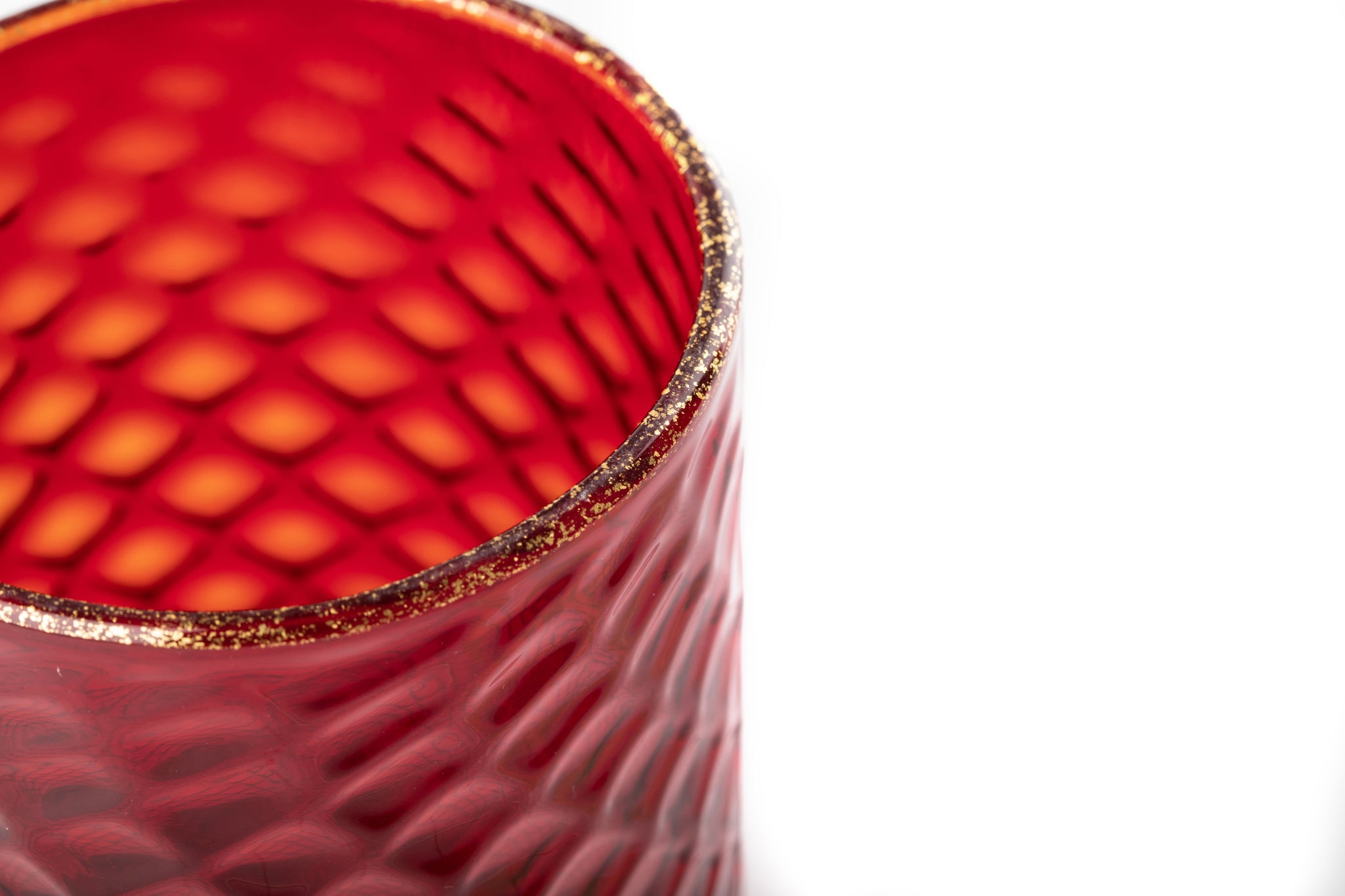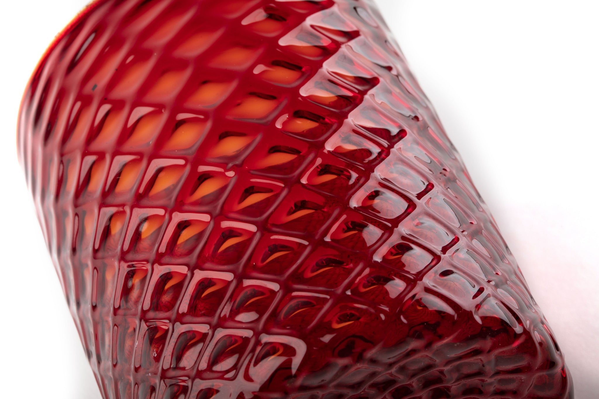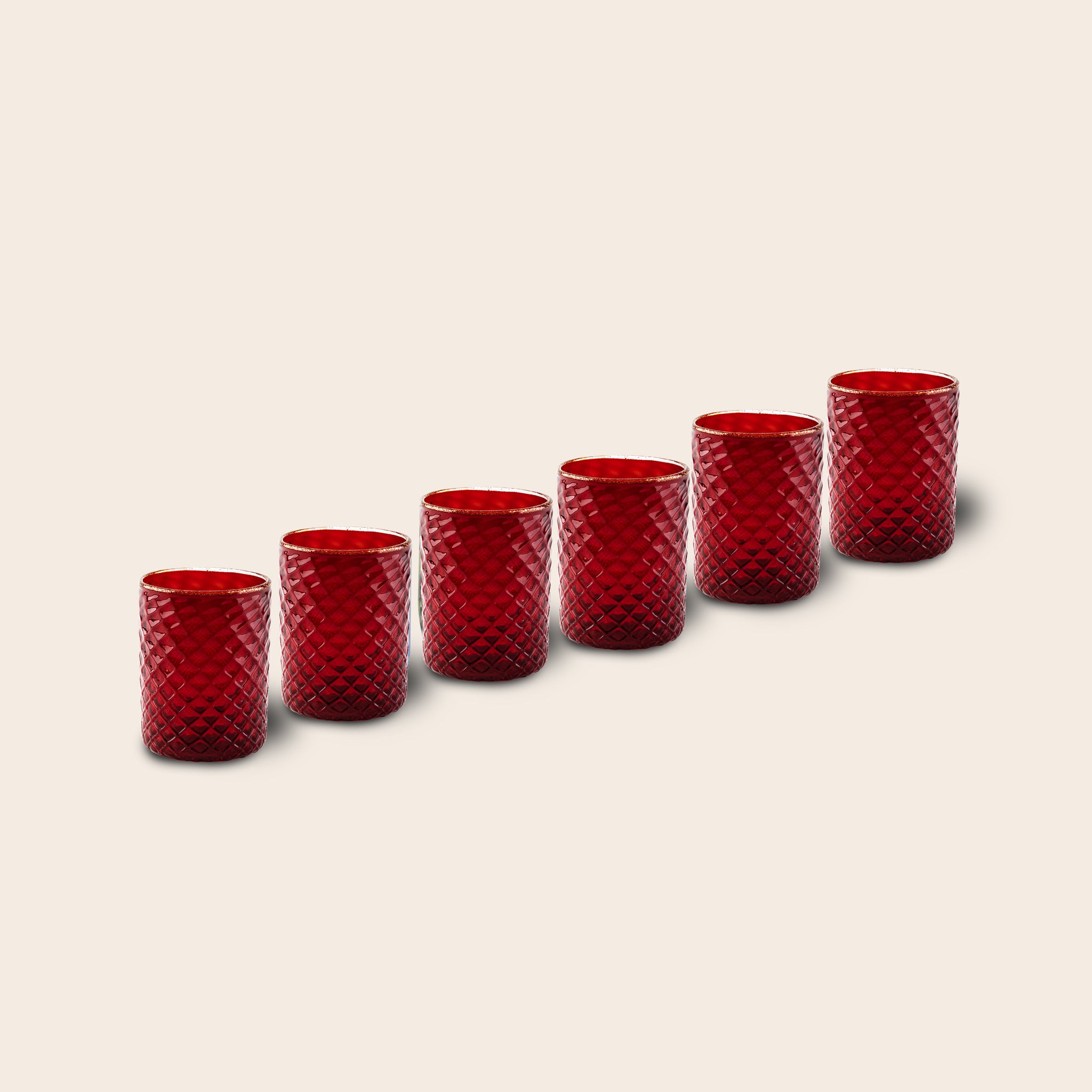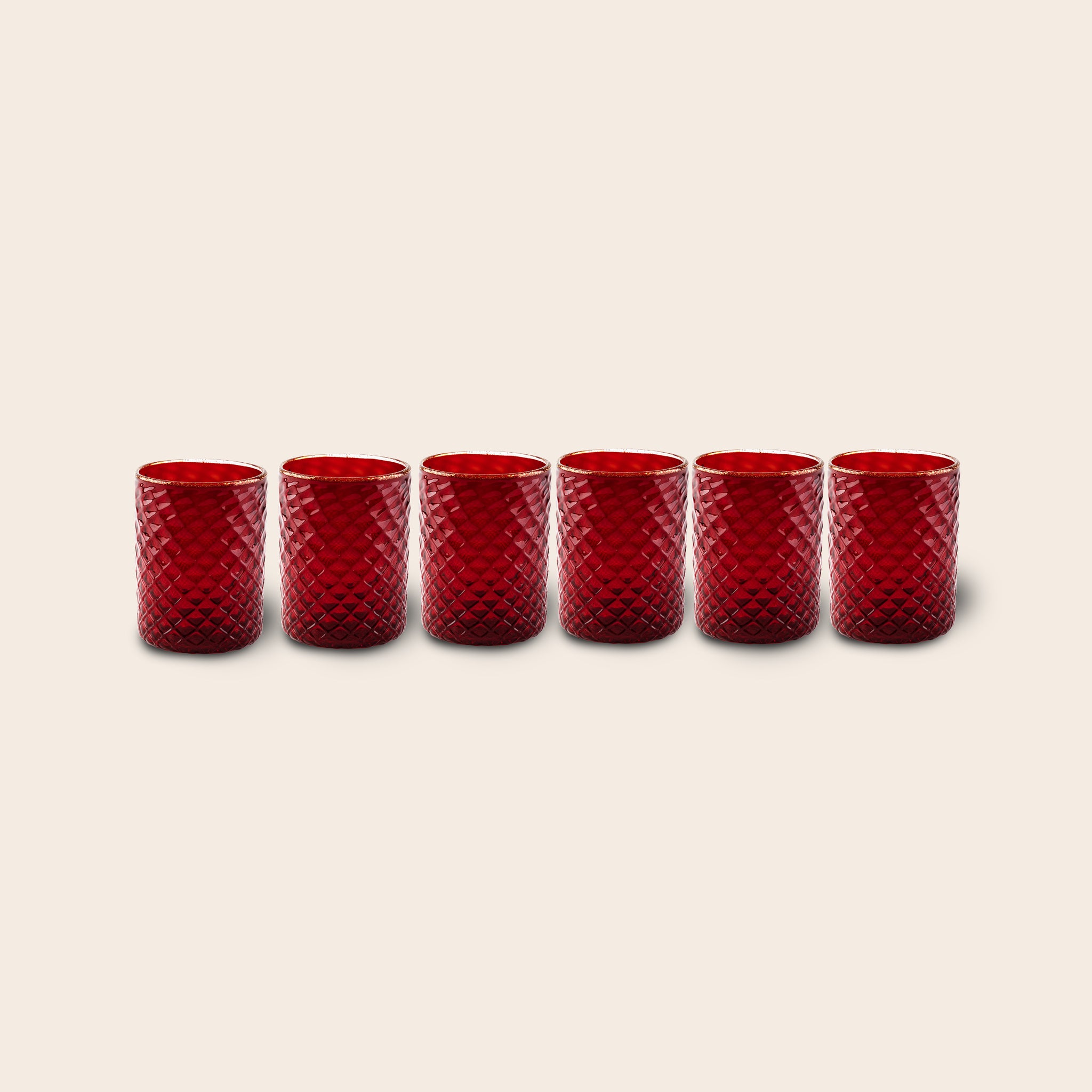 Set di 6 Bicchieri "Ruby Red Tola Goti", reticello, creando un raffinato rilievo in vetro soffiato su tutta la superficie. Ogni pezzo è modellato individualmente, dando origine a sottili variazioni che ne evidenziano la natura artigianale. Il bordo presenta un delicato incalmo con un filo di vetro trasparente arricchito con oro sommerso, che aggiunge un elegante tocco finale. Ogni bicchiere misura circa Ø 8 cm x A 10 cm, con lievi differenze che riflettono l'autenticità dell'artigianato di Murano. Un set sofisticato progettato per portare l'intramontabile arte italiana in ogni momento.