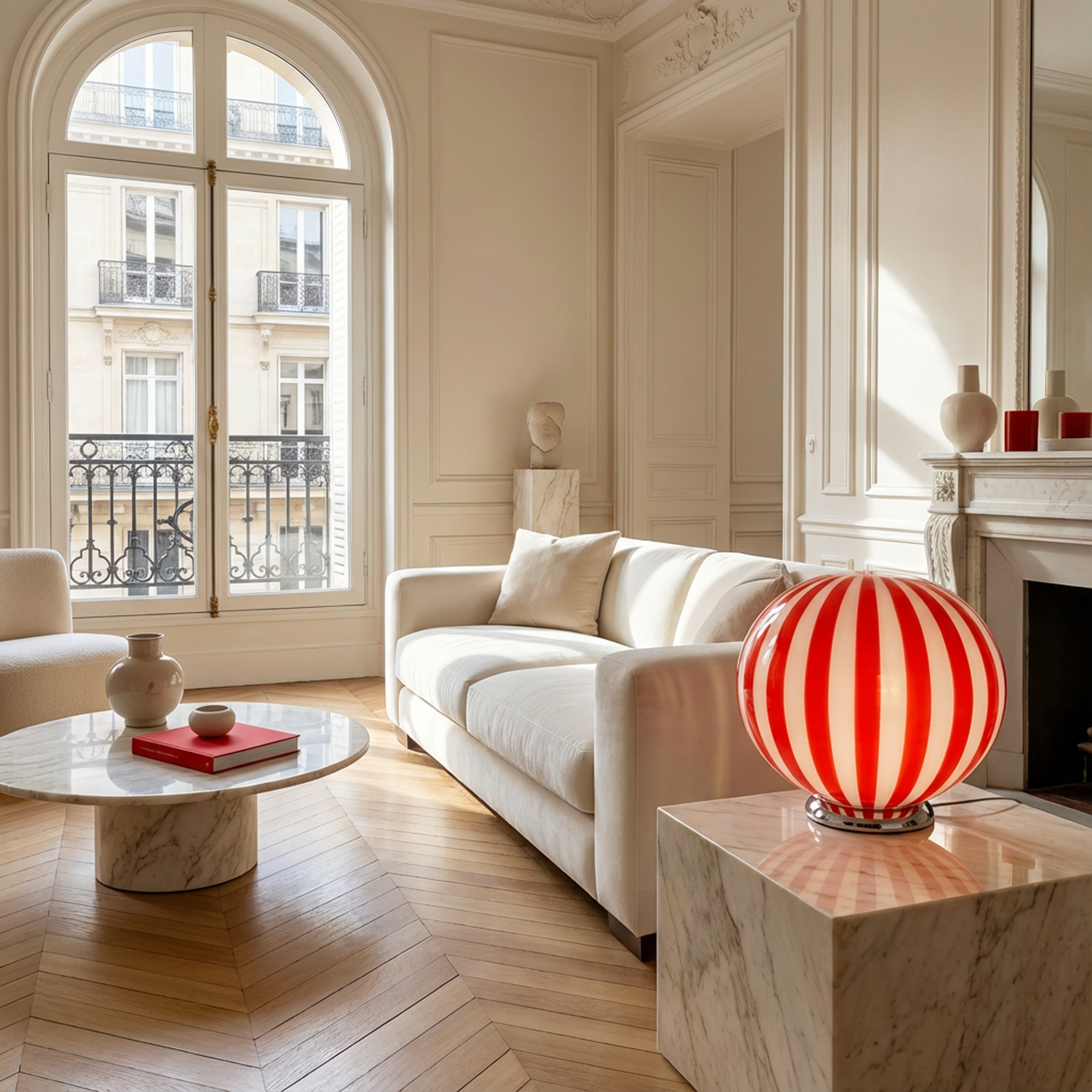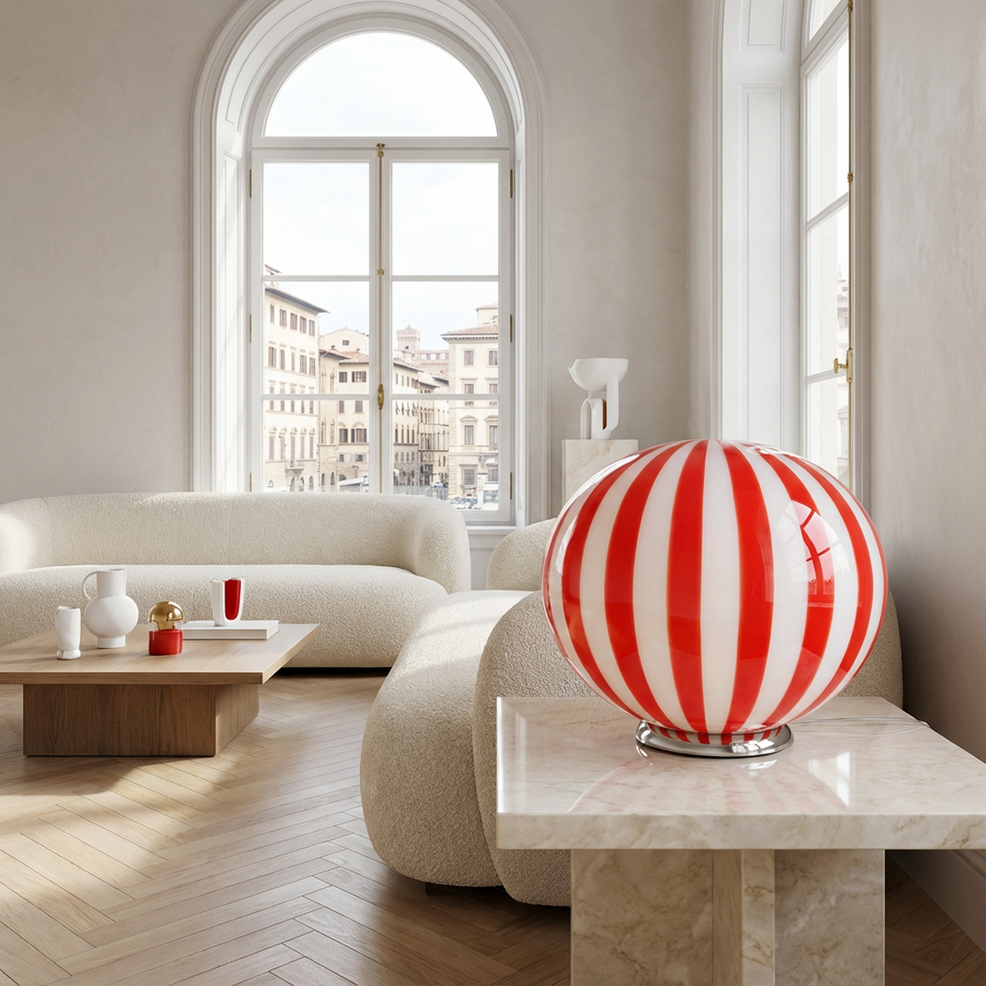 Lampada da tavolo Candy ovale in vetro di Murano rossa e bianca D40