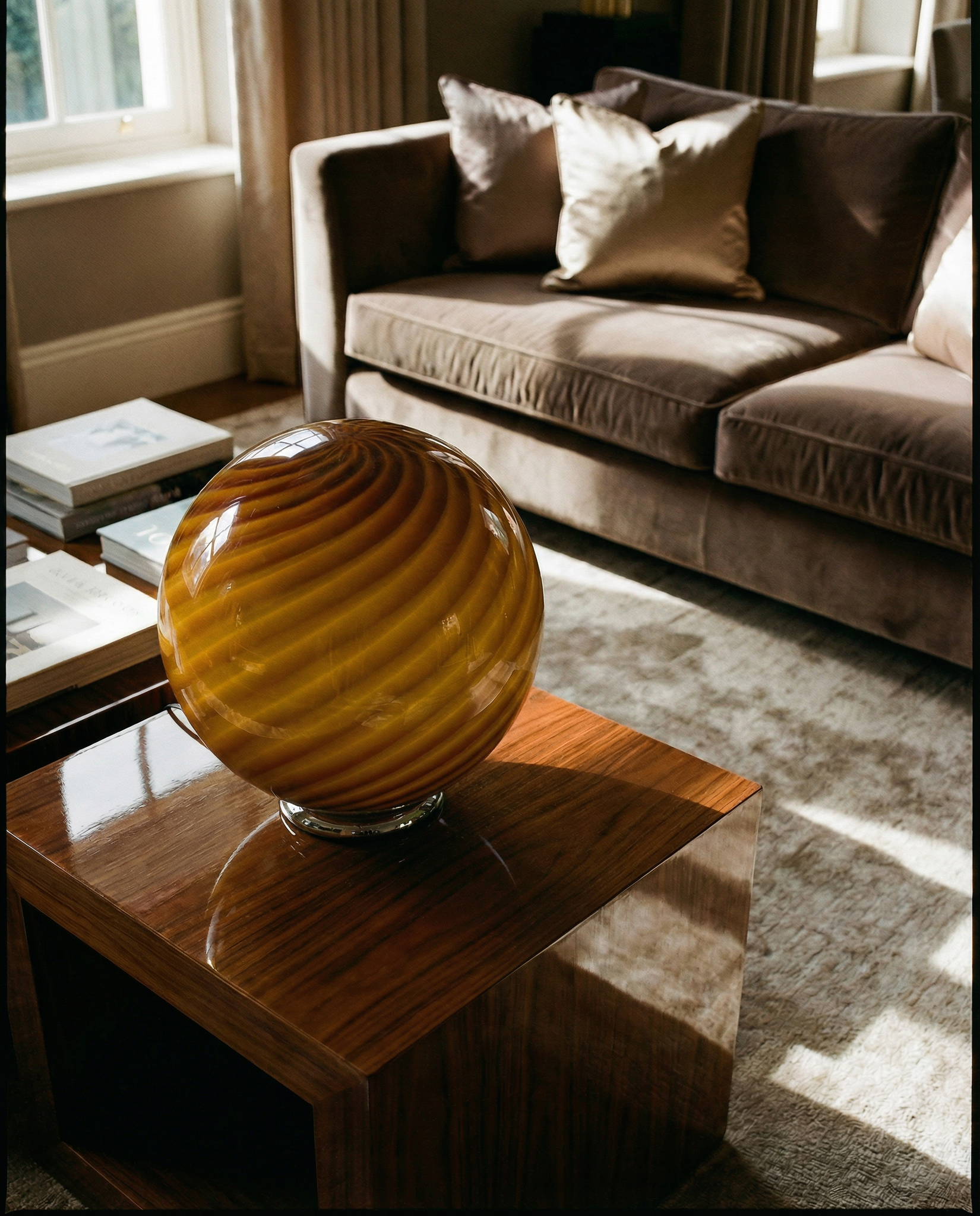 la forma sferica crea una presenza elegante su qualsiasi superficie, proiettando una luce calda e diffusa attraverso l'autentico vetro italiano.