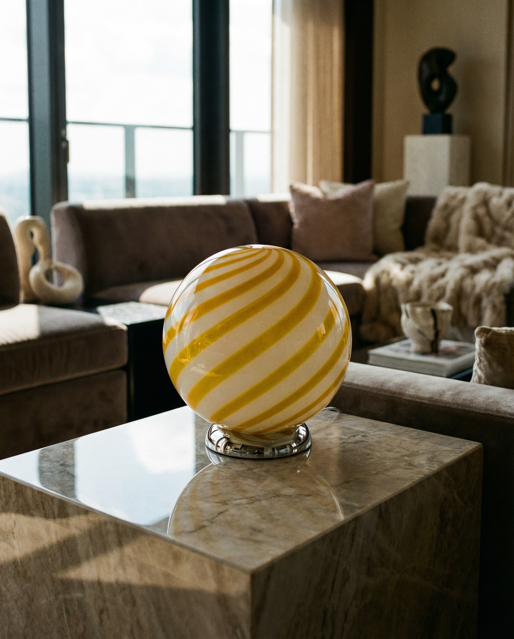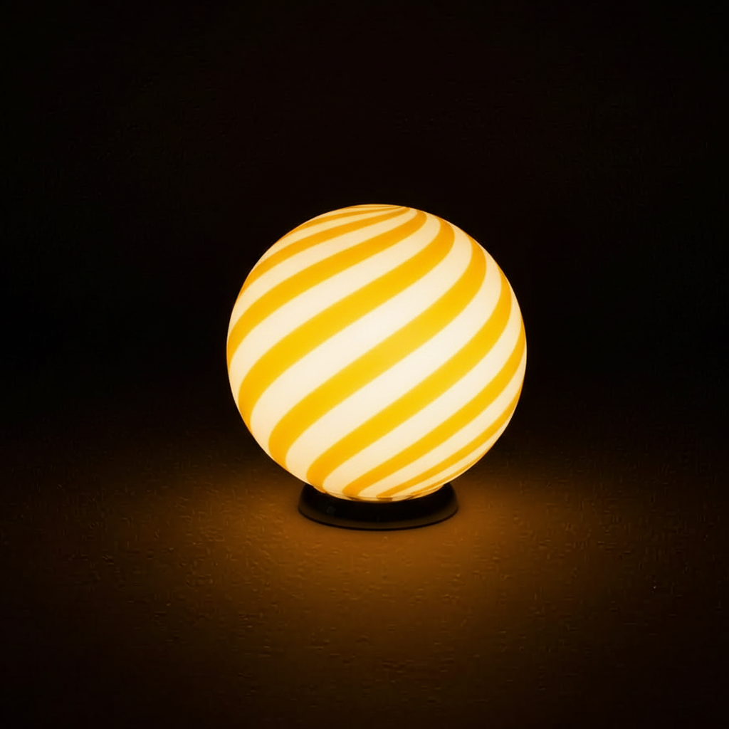Lampada da tavolo Candy a sfera in vetro di Murano bianco e giallo a spirale D20