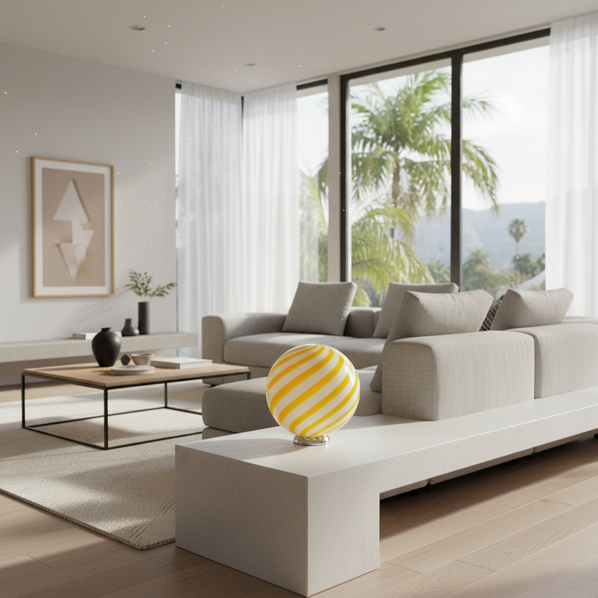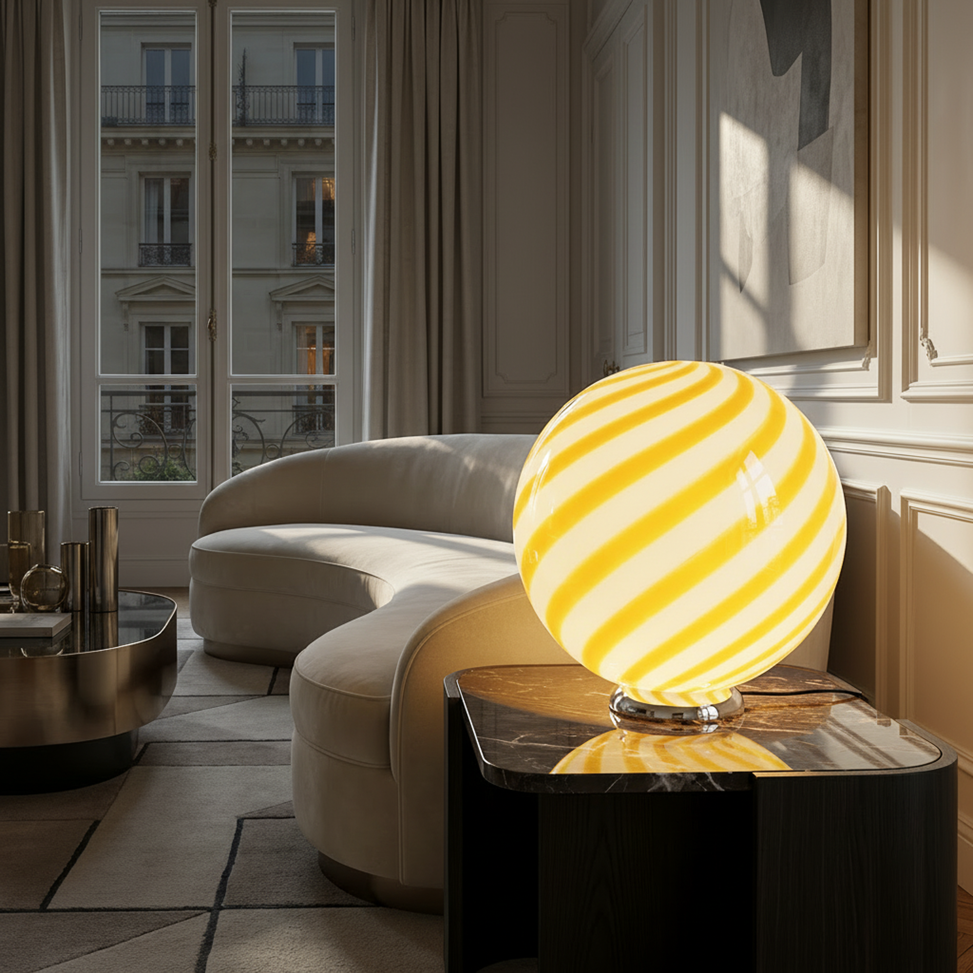 Lampada da tavolo Candy a sfera in vetro di Murano bianco e giallo a spirale D30