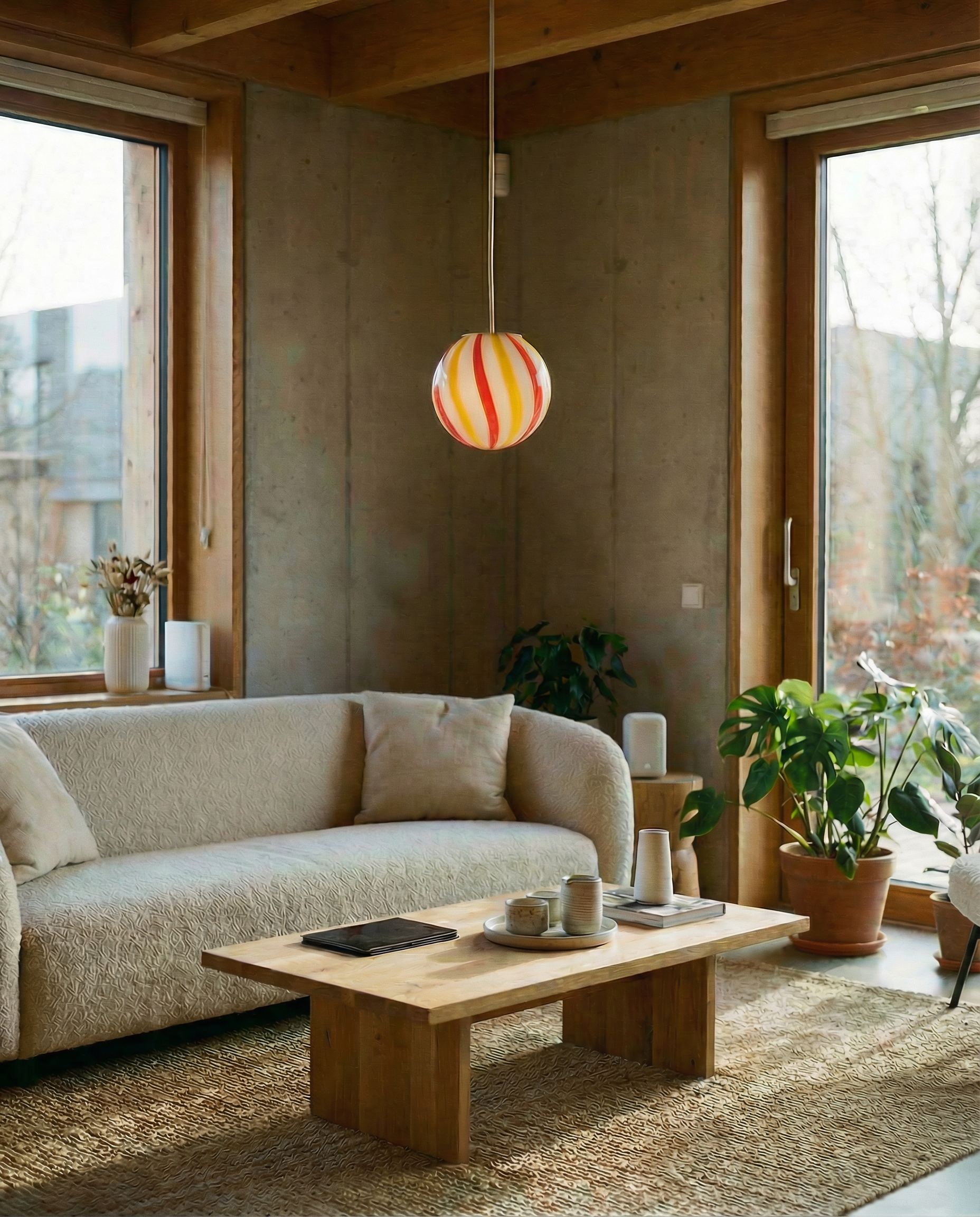The Murano Candy Lamp is crafted in Venice, Italy using traditional mouth-blown glass techniques and fitted with an E27 bulb holder. It includes an adjustable suspension system to suit different installation heights. The piece measures 20 cm in diameter and weighs around 1 kg.