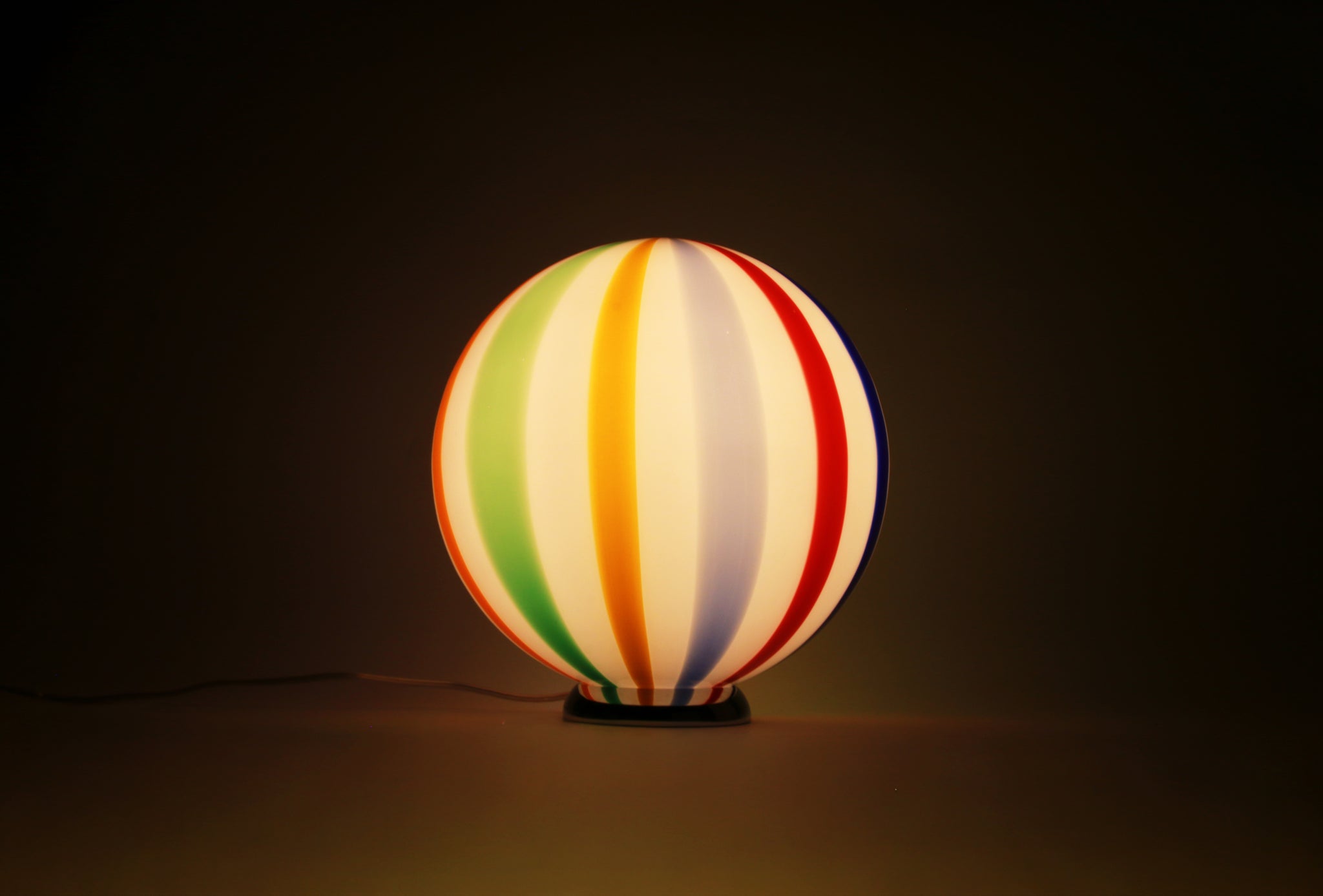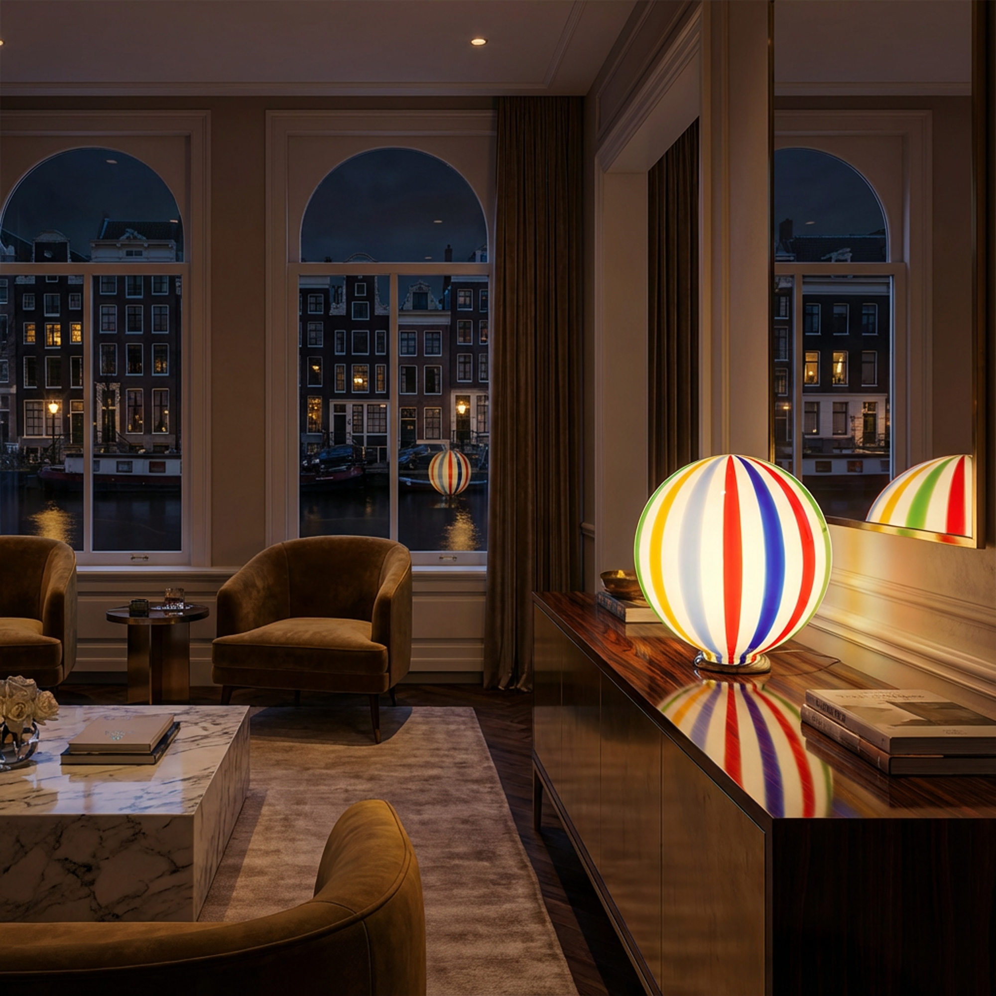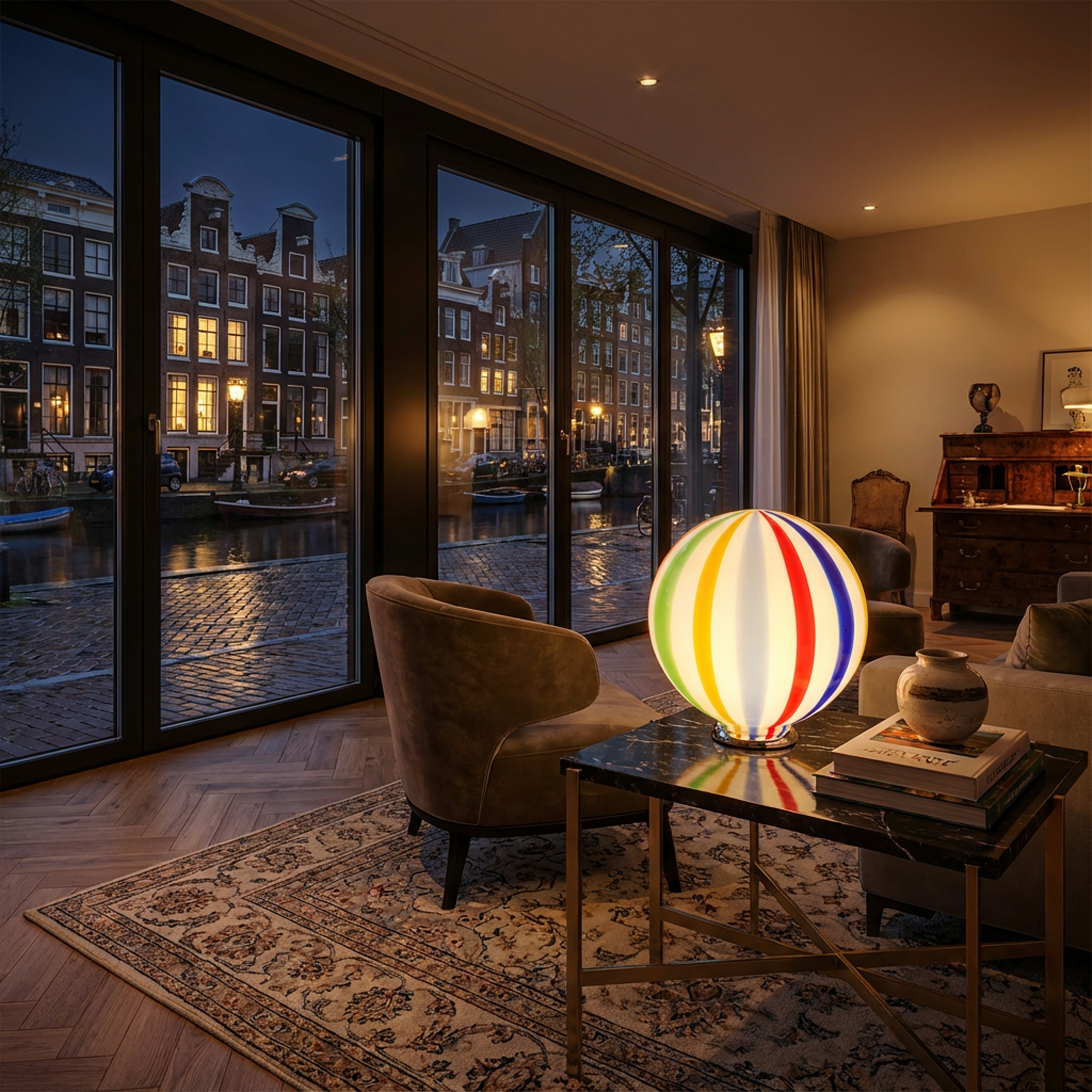 The Murano Candy Lamp is crafted in Venice, Italy using traditional mouth-blown glass techniques and fitted with an E27 bulb holder. It includes a metal base. The piece measures 30 cm in diameter and weighs around 3 kg.