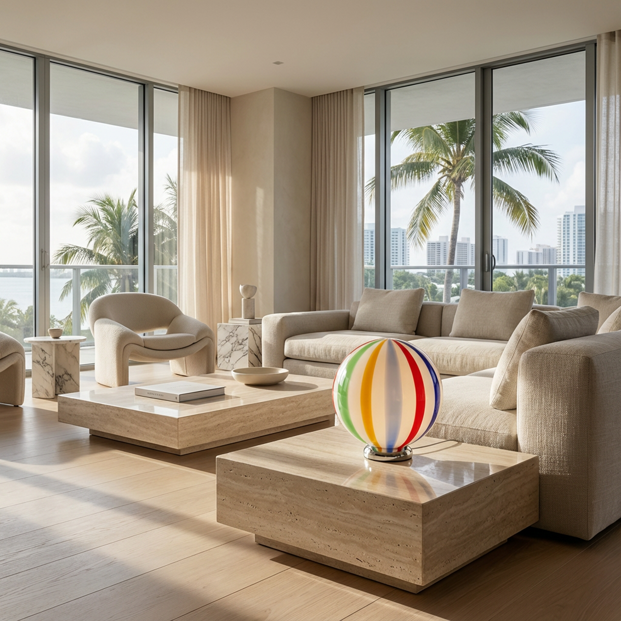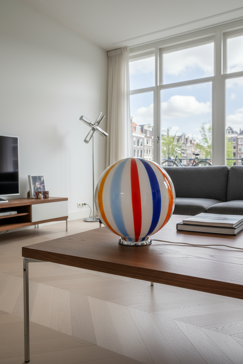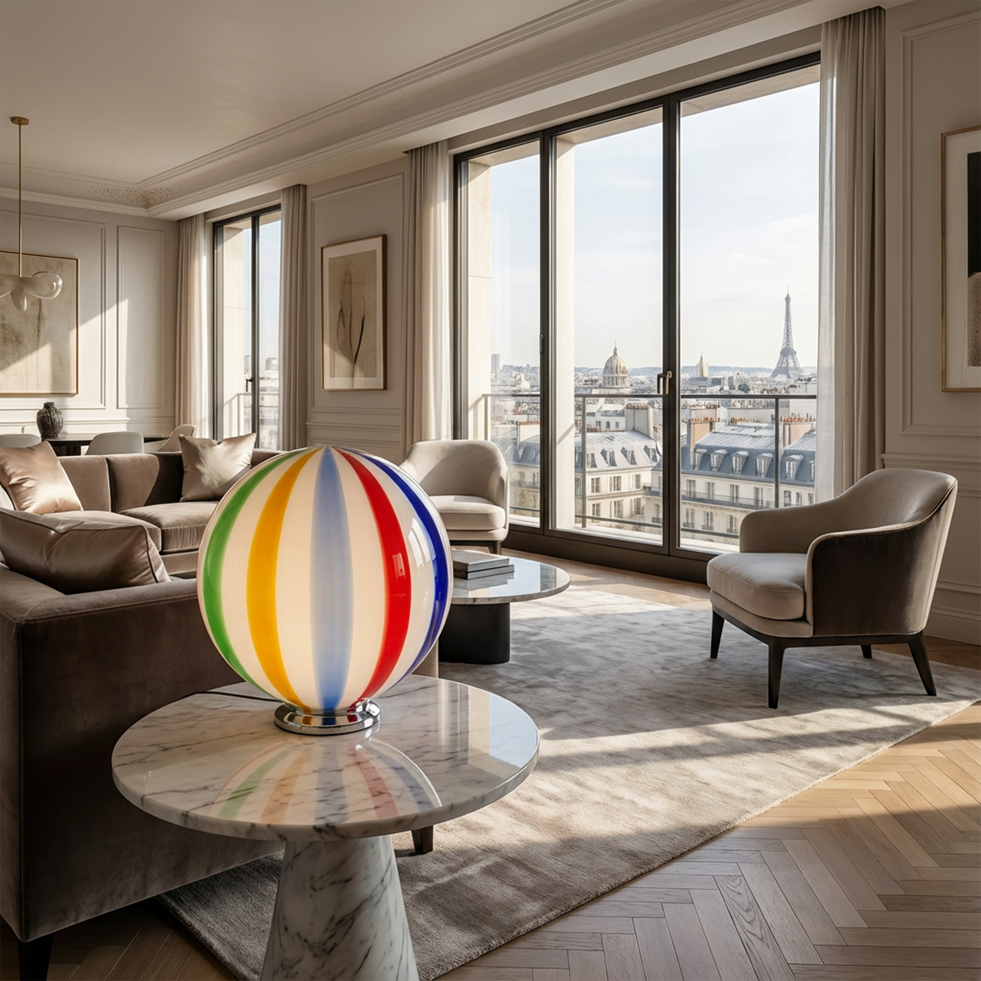 The Murano Candy Lamp is crafted in Venice, Italy using traditional mouth-blown glass techniques and fitted with an E27 bulb holder. It includes a metal base. The piece measures 30 cm in diameter and weighs around 3 kg.