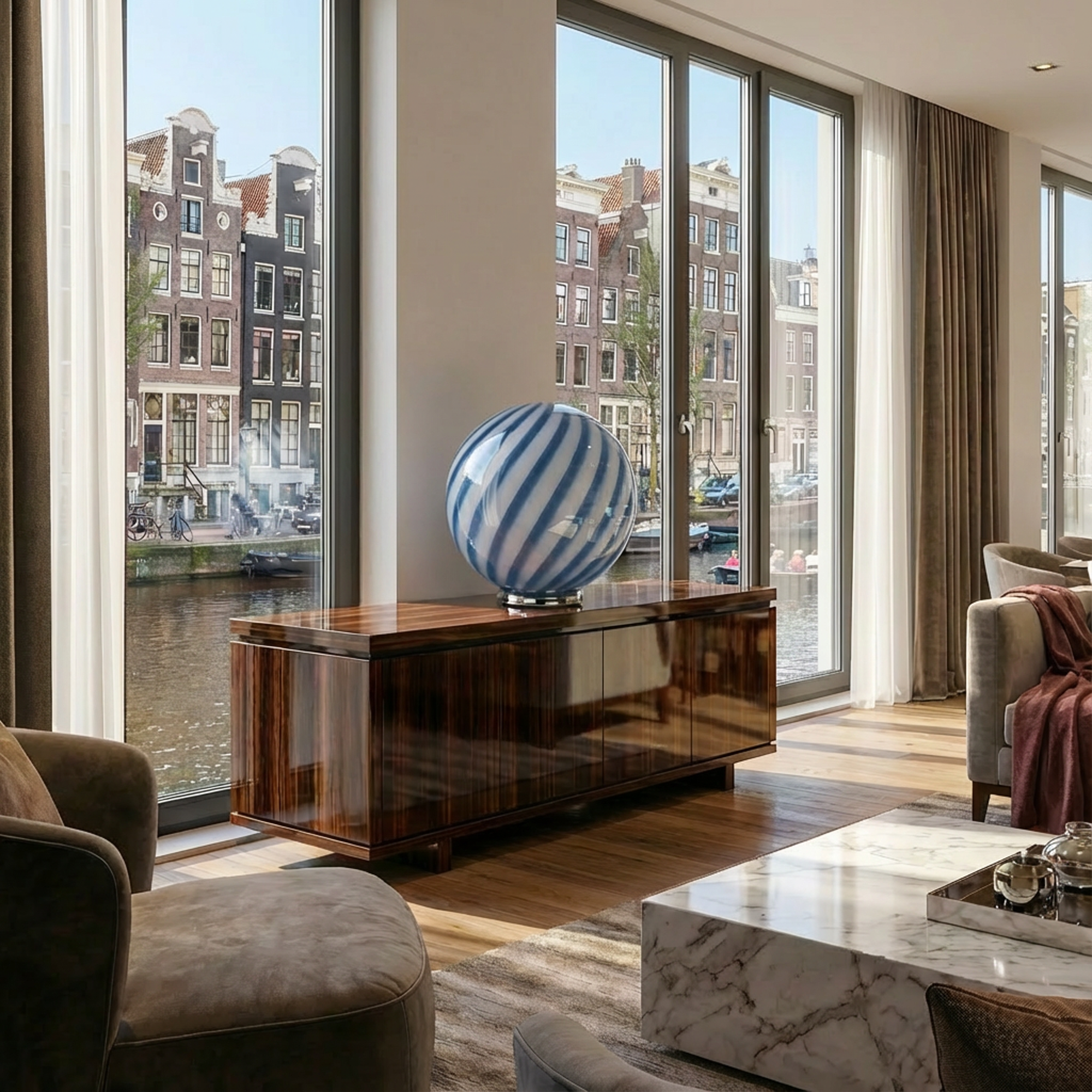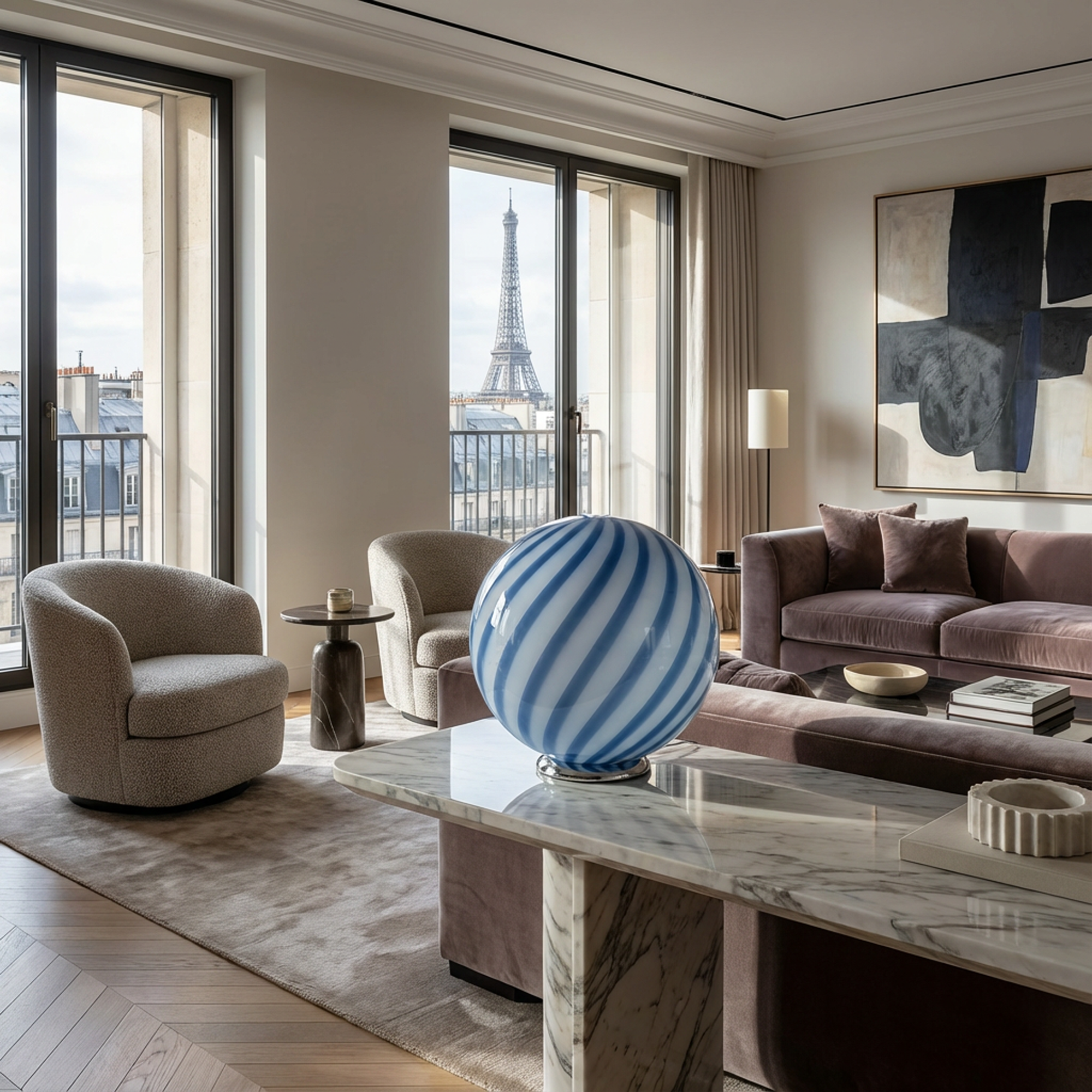 The Murano Candy Lamp is crafted in Venice, Italy using traditional mouth-blown glass techniques and fitted with an E27 bulb holder. It includes a metal base. The piece measures 40 cm in diameter and weighs around 5 kg.