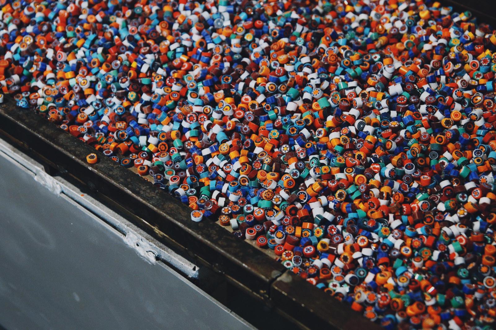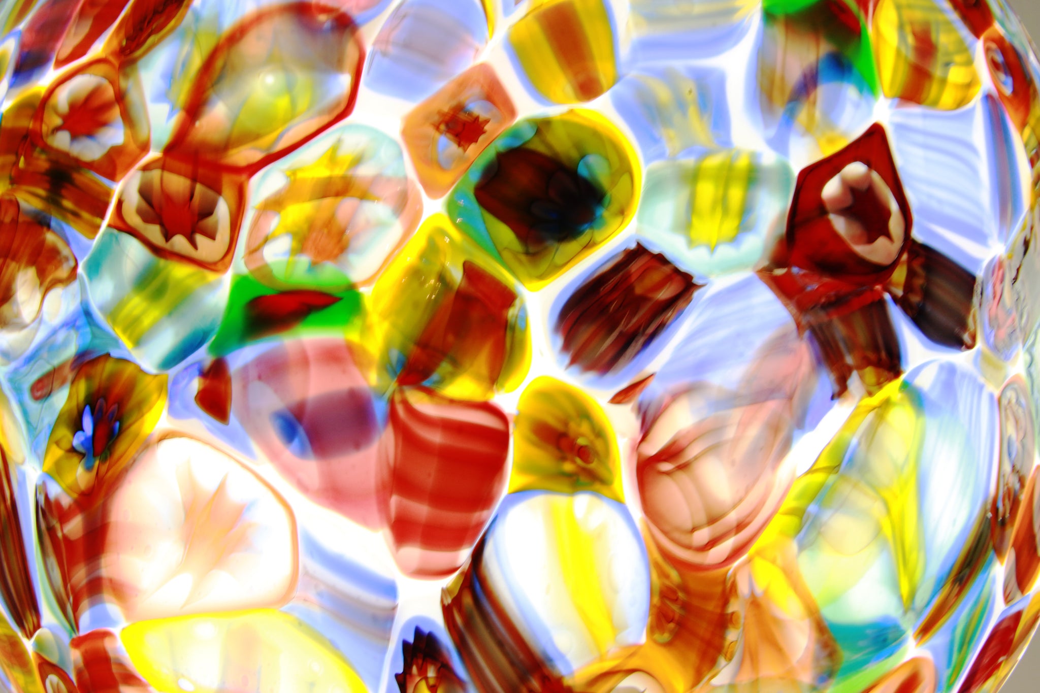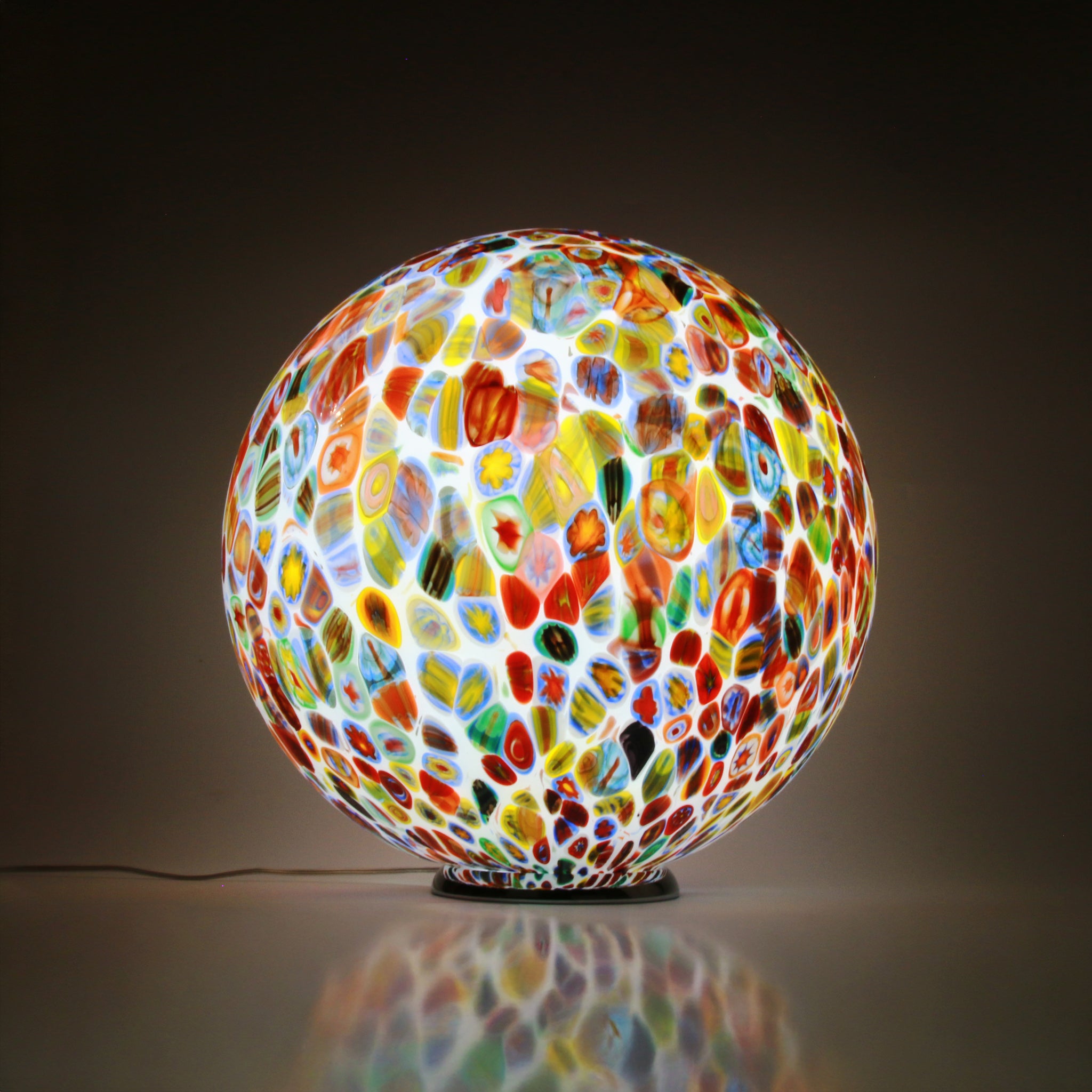 The Murano Candy Lamp is crafted in Venice, Italy using traditional mouth-blown glass techniques and fitted with an E27 bulb holder. It includes a metal base. The piece measures 40 cm in diameter and weighs around 5 kg.