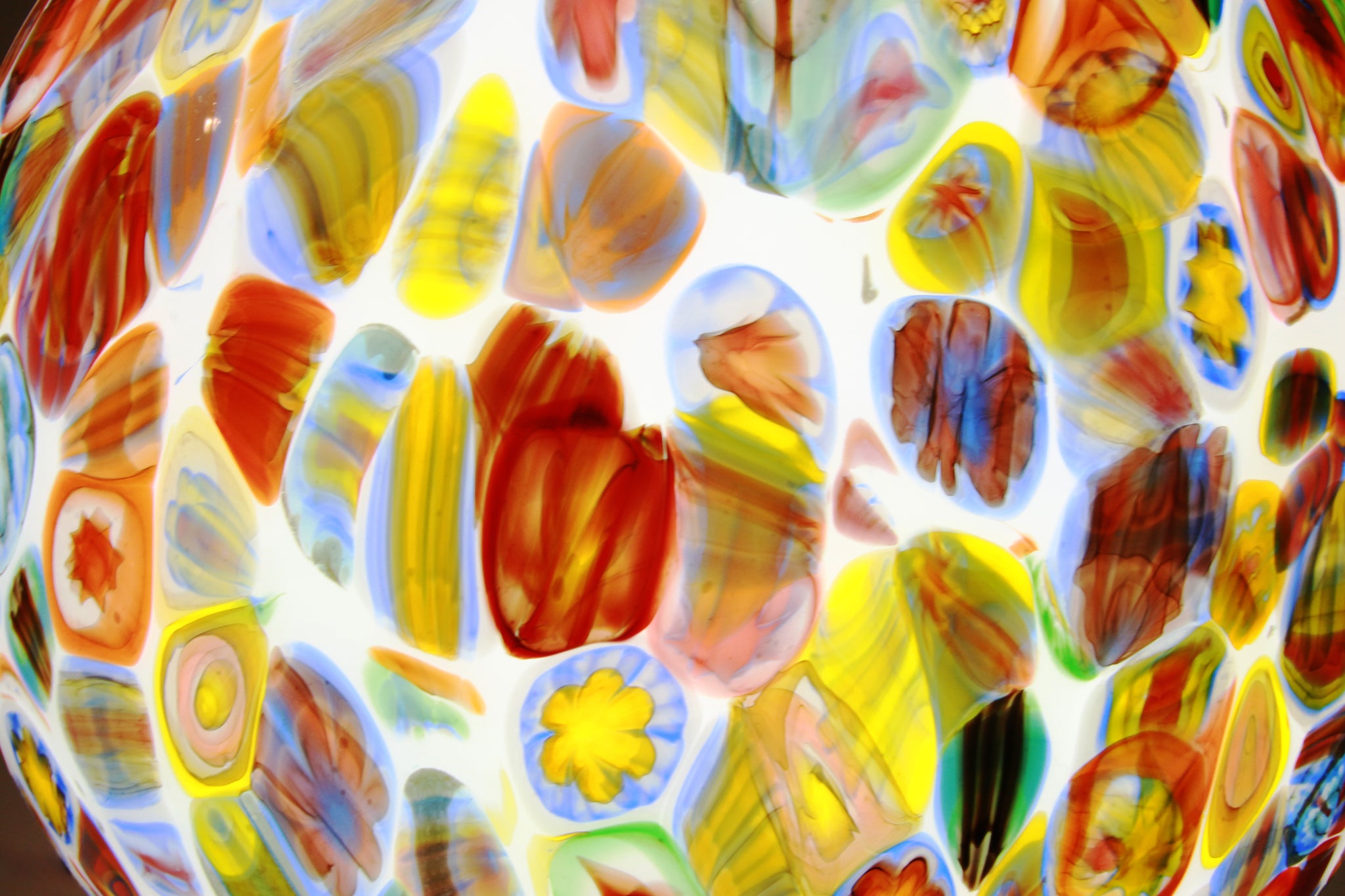 The Murano Candy Lamp is crafted in Venice, Italy using traditional mouth-blown glass techniques and fitted with an E27 bulb holder. It includes a metal base. The piece measures 50 cm in diameter and weighs around 7 kg.