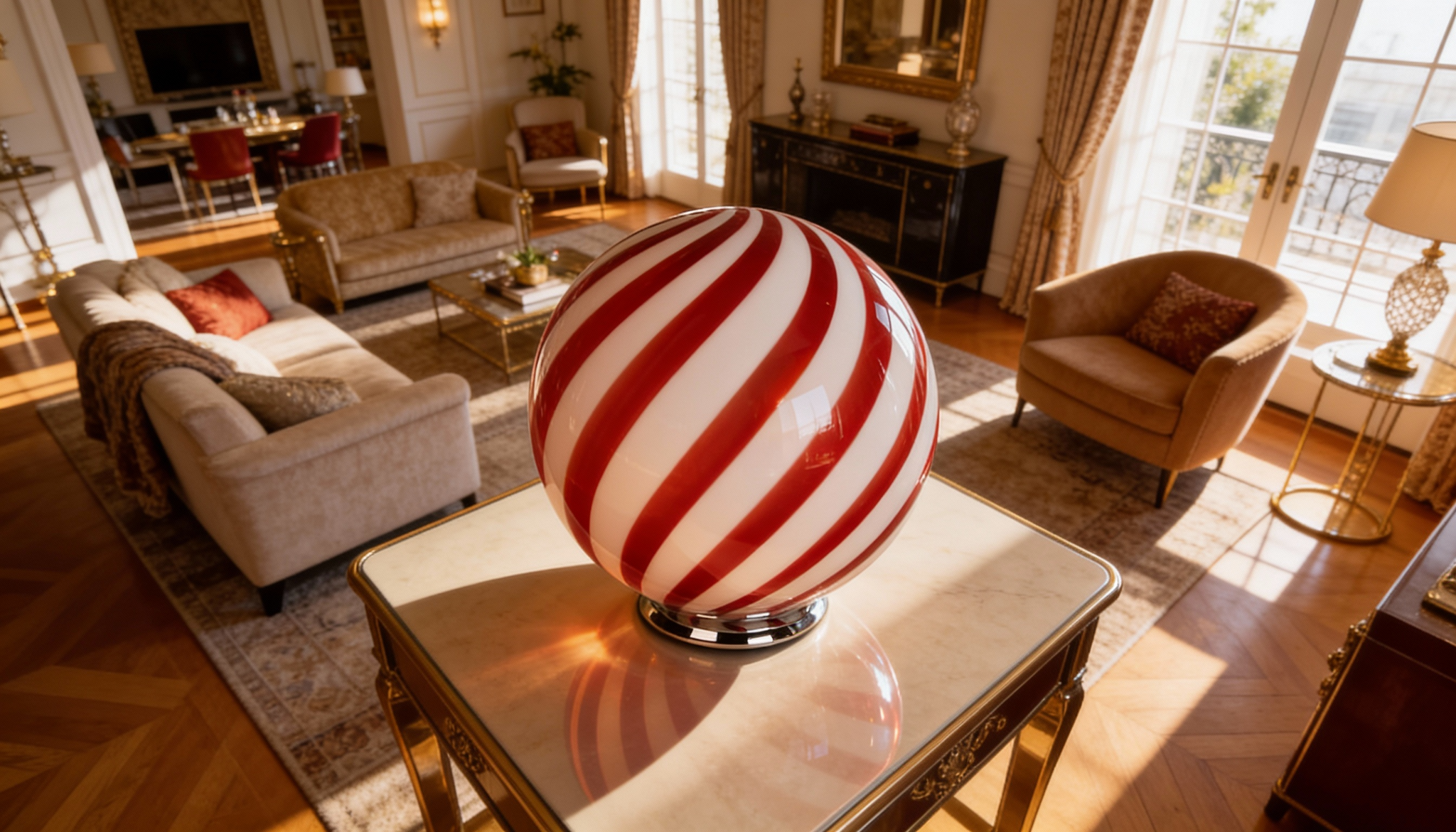 The Murano Candy Lamp is crafted in Venice, Italy using traditional mouth-blown glass techniques and fitted with an E27 bulb holder. It includes a metal base. The piece measures 40 cm in diameter and weighs around 5 kg.