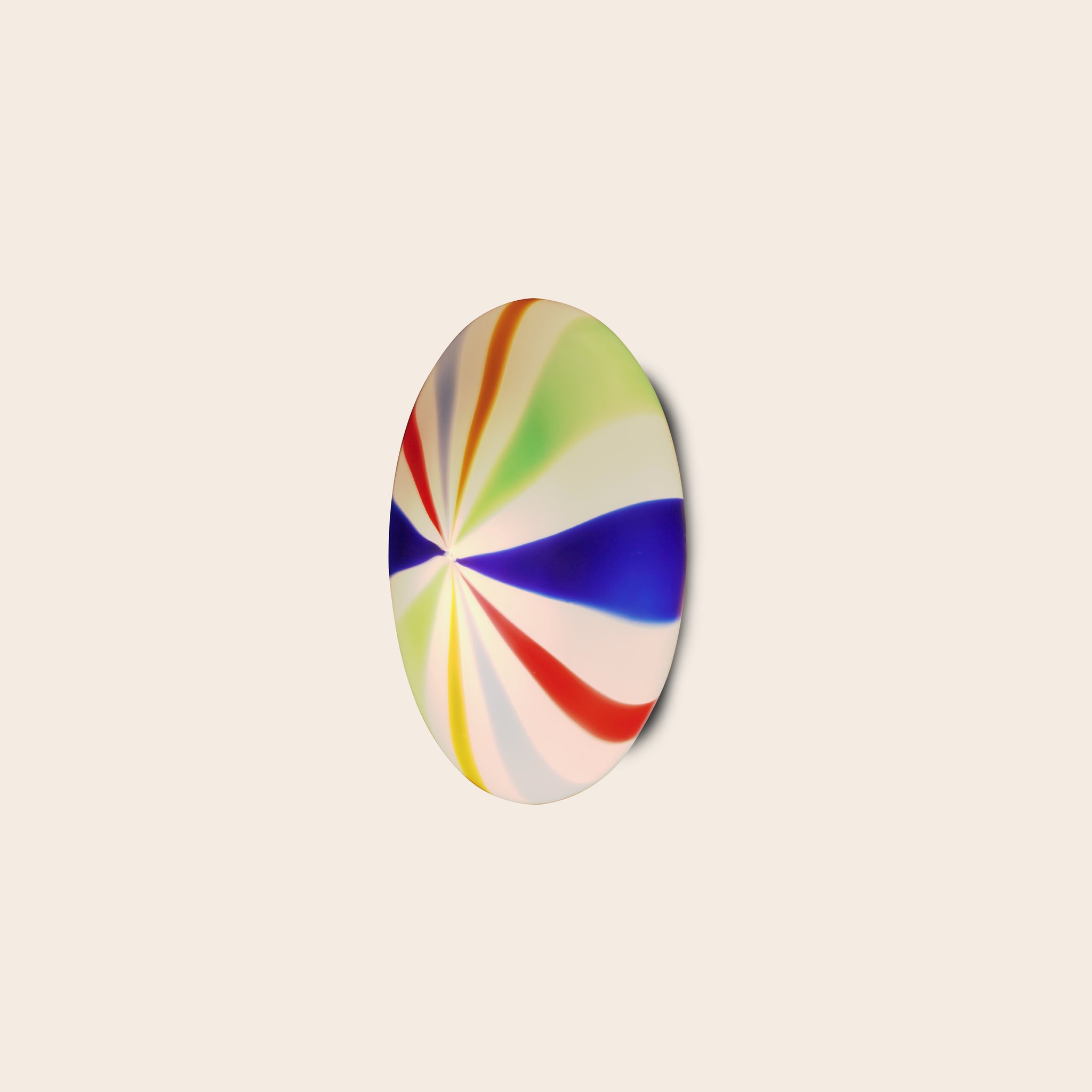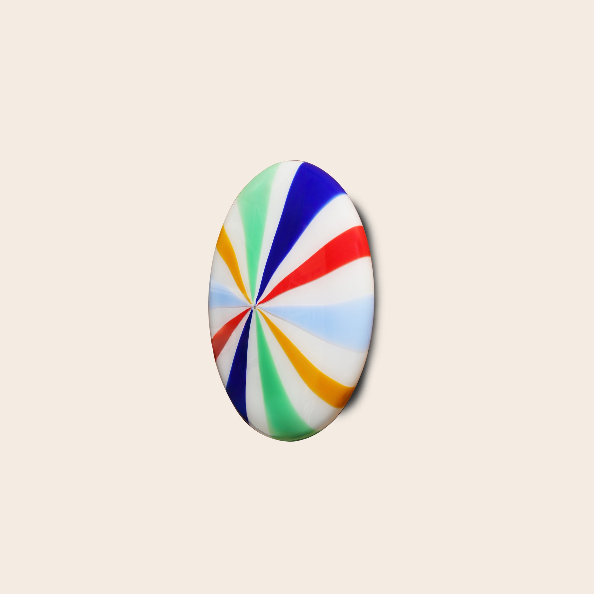 The Murano Candy Lamp is crafted in Venice, Italy using traditional mouth-blown glass techniques and fitted with an E27 bulb holder. It includes an adjustable suspension system to suit different installation heights. The piece measures 30 cm in diameter and weighs around 2 kg.